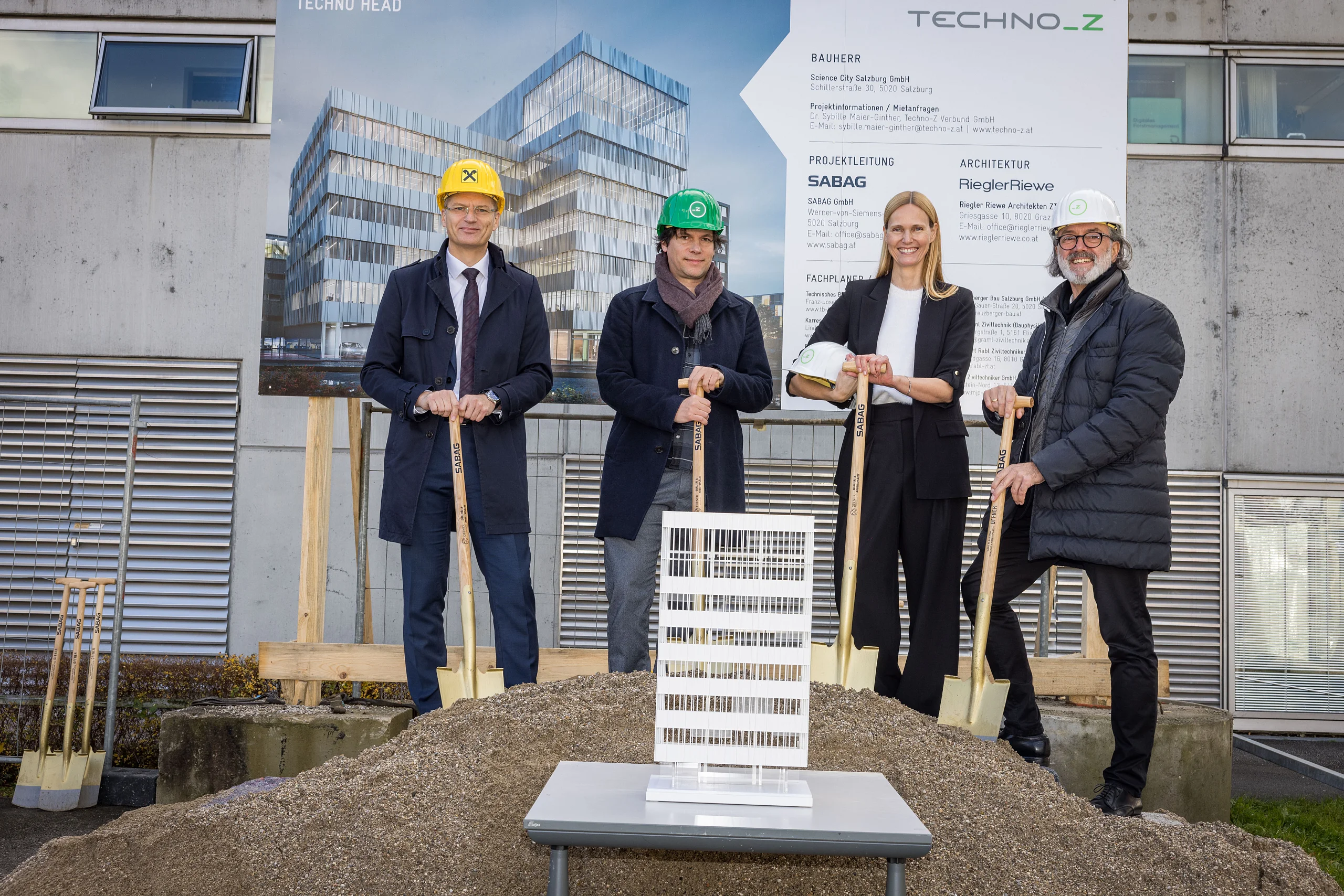 Bild: v.l. Andreas Derndorfer, Geschäftsleiter Unternehmenssteuerung Raiffeisenverband Salzburg, Christian Story, Geschäftsführer Riegler Riewe Architekten, Sybille Maier-Ginther, Prokuristin Techno-Z Verbund GmbH, Werner Pfeiffenberger, Geschäftsführer Techno-ZVerbund GmbH. Copyright: wild&team/Günter Freund